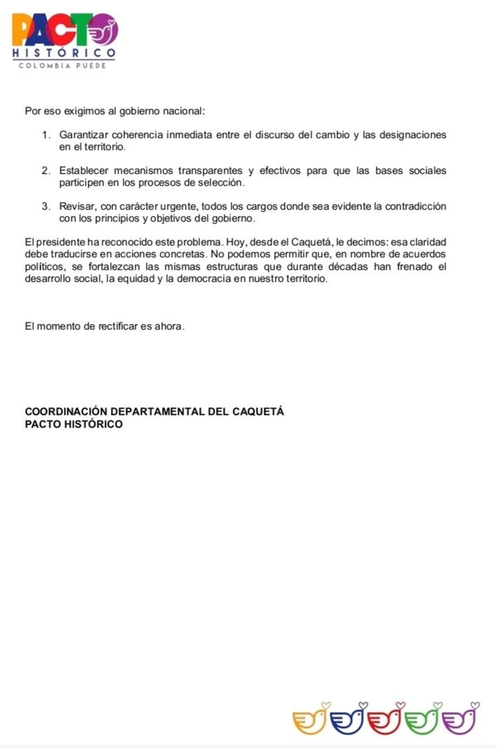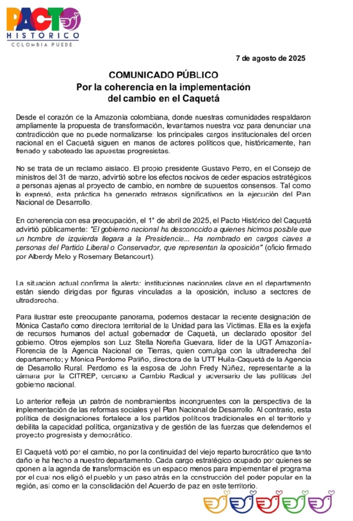 En coherencia con esa preocupación, el 1° de abril de 2025, el Pacto Histórico del Caquetá advirtió públicamente: “El gobierno nacional ha desconocido a quienes hicimos posible que un hombre de izquierda llegara a la Presidencia… Ha nombrado en cargos claves a personas del Partido Liberal o Conservador, que representan la oposición” (oficio firmado por Alberdy Melo y Rosemary Betancourt).